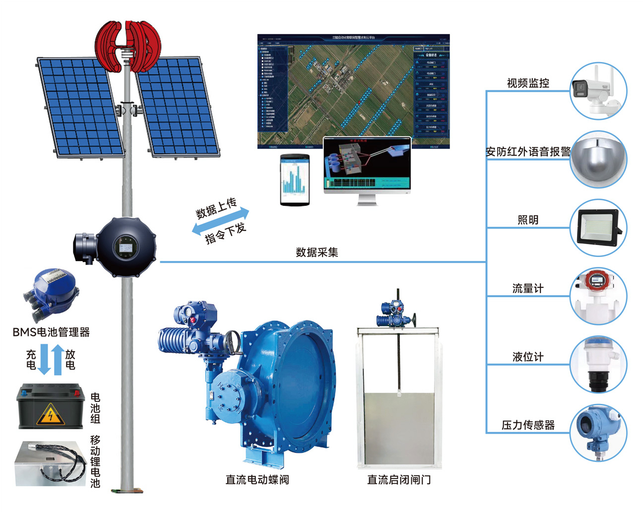 由太陽能光伏板和小型風(fēng)力發(fā)電機為蓄能電池組充電,電池組有BMS電池管理軟件管控,為永磁無刷直流電機的各類驅(qū)動裝置供電,同時為視頻監(jiān)控,壓力、流量、液位傳感器,照明等供電